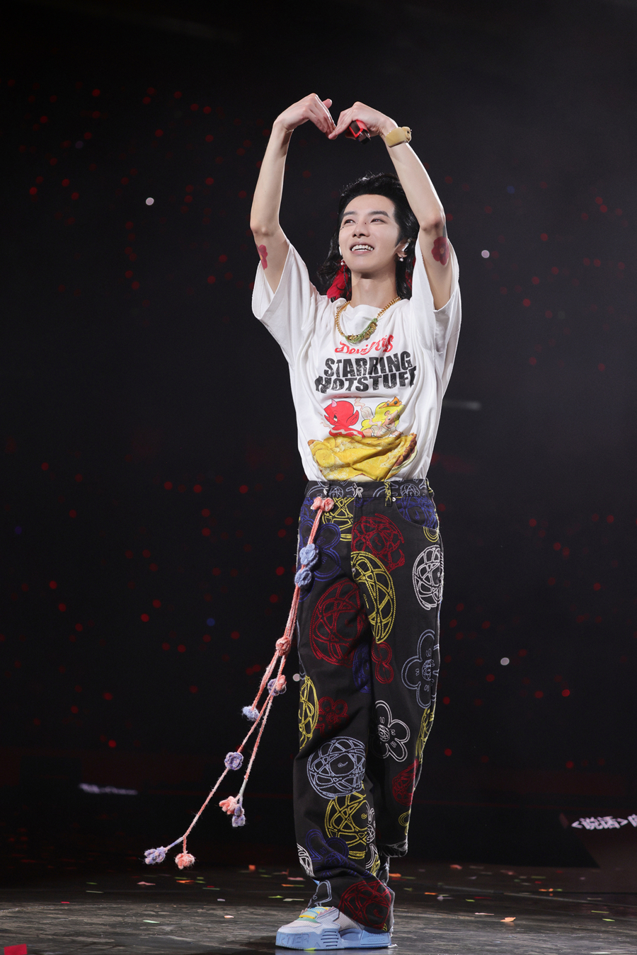 華晨宇在舞臺上說,“我的愿望是希望所有的火星人能在現(xiàn)在、還有未來可以一直都幸福?!彼e起了精心準(zhǔn)備的飯撒牌,繞場足足6分鐘,與四面臺的所有歌迷互動,飯撒牌上寫著,“火星人,感到幸福就比心”“愛有多深刻”。