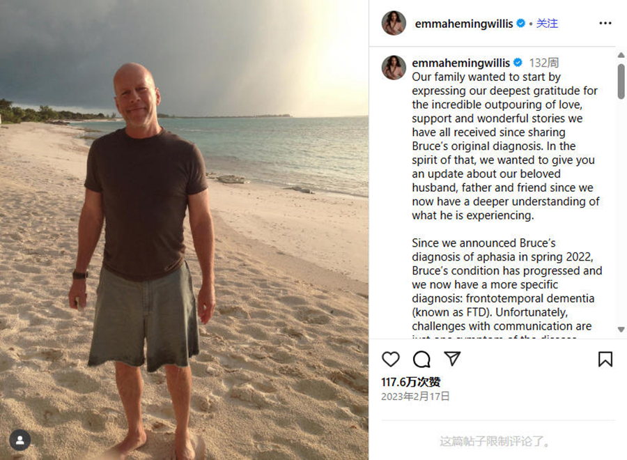 2022年,布魯斯·威利斯的家人發(fā)布聯(lián)合聲明,宣布他將退出演藝事業(yè)。因為他被診斷患上失語癥,這影響了他的認(rèn)知能力和溝通能力。一年后,家人再次發(fā)文透露,他的病情進一步發(fā)展,且有了更具體的診斷結(jié)果:額顳葉癡呆(FTD)。