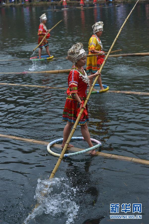 1月1日,“獨(dú)竹漂”愛好者在花溪河上表演水上高難度平衡動(dòng)作。 2016年元旦,在貴陽市花溪公園平橋河段舉行的貴陽市第31屆冬泳表演活動(dòng)中,數(shù)十名“獨(dú)竹漂”愛好者在花溪河上腳踏漂浮的竹竿,表演“金雞獨(dú)立”、轉(zhuǎn)身平衡等高難度動(dòng)作,讓觀眾大飽眼福。新華社發(fā)(秦剛 攝)