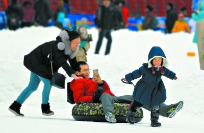 鳥巢主場(chǎng)北側(cè)的歡樂(lè)戲雪區(qū)是一片無(wú)拘無(wú)束的雪海:拉上雪圈繩就能孩子載著爸媽、爸媽載著孩子在雪圈廣場(chǎng)恣意撒歡兒。(記者左穎)