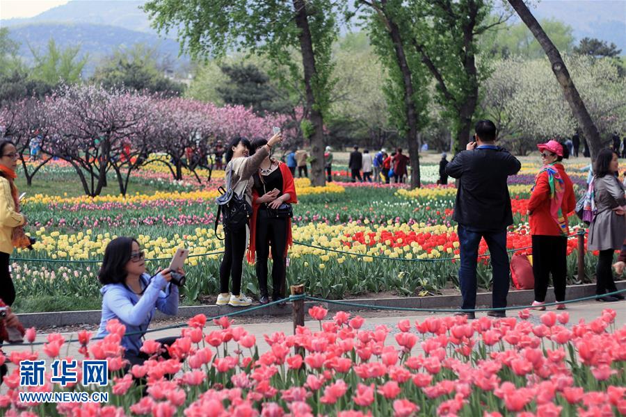 北京植物園內盛開的郁金香花(4月11日攝)。近日,北京植物園內的郁金香競相開放,吸引眾多游人前來觀賞。 新華社記者 李明放攝