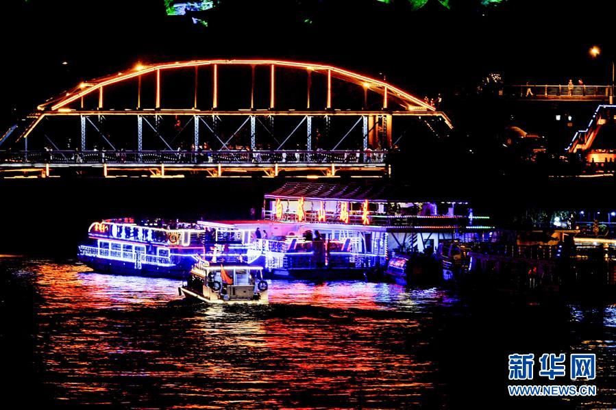 6月14日,一艘游輪從黃河蘭州段中山橋下穿過。自6月12日起,蘭州黃河游輪夏季夜航航線正式開通。據(jù)了解,作為黃河蘭州段水上旅游重點(diǎn)線路,該航線由蘭州市城關(guān)區(qū)蘭州港碼頭和白塔山碼頭始發(fā),每晚20時(shí)起開行,全程約6公里,運(yùn)行時(shí)長(zhǎng)50分鐘左右。游客可以乘坐豪華游輪欣賞黃河夜景,感受蘭州黃河風(fēng)情線別樣魅力。新華社記者 陳斌 攝