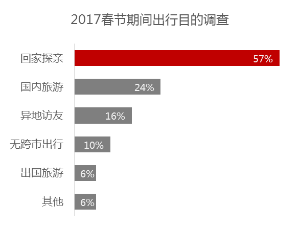《報(bào)告》關(guān)于2017年春節(jié)跨市出行(長途出行)意愿的在線問卷調(diào)查數(shù)據(jù)顯示,“回家探親”是受訪者春節(jié)期間長途出行的第一大動機(jī),“國內(nèi)旅游”則是第二大出行動機(jī)??傮w而言,受訪者能夠明確給出的春節(jié)出行動機(jī)中,除了“回家探親”,就是旅游(國內(nèi)游和出境游)。這表明,居民2017年春節(jié)期間的旅游消費(fèi)意愿強(qiáng)烈,旅游過年已經(jīng)成為較為主流的過年方式。