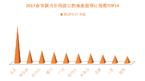 一般情況下,春節(jié)期間的國內(nèi)長線游(行程3日以上,居住地300公里外)需求的出游人數(shù)在總體長線游需求中占比最大。《報(bào)告》數(shù)據(jù)顯示,北京、哈爾濱、長白山、廈門、廣州、牡丹江、亞布力、吉林、三亞、昆明是2017年春節(jié)期間最熱門的十個目的地(以《報(bào)告》發(fā)布時(shí)的線路預(yù)訂數(shù)據(jù)統(tǒng)計(jì)),其中哈爾濱、長白山、牡丹江、亞布力、吉林五個目的地全部來自東北地區(qū),春節(jié)期間冰雪游線路的火爆是它們上榜的共同原因,廈門、三亞、昆明等則為黃金周國內(nèi)游傳統(tǒng)熱門目的地。另外,不同城市居民春節(jié)國內(nèi)長線游的目的地偏好略有差異,例如,北京最受歡迎的春節(jié)國內(nèi)游目的地主要有廣州、珠海、哈爾濱、長白山,上海最受歡迎的春節(jié)國內(nèi)游目的地主要有長白山、北海、三亞、北京等,廣州最受歡迎的春節(jié)國內(nèi)游目的地主要有貴陽、張家界等。