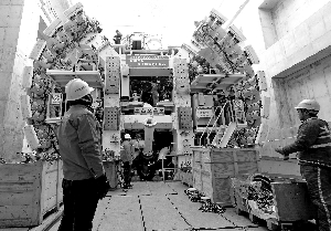北京晨報記者在現(xiàn)場看到,各種吊車、大型作業(yè)機(jī)器正在緊張作業(yè)中。記者走到隧道“洞口”處看到, 腳下一臺巨型的盾構(gòu)機(jī)呈現(xiàn)在眼前,由于隧道采用明挖法、暗挖法、盾構(gòu)法相結(jié)合的施工作業(yè)方法,據(jù)記者目測,從盾構(gòu)機(jī)最底端到記者所在的地面約有七八層樓高。幾十名施工人員正冒著寒風(fēng)對盾構(gòu)機(jī)進(jìn)行組裝、吊裝。北京晨報記者了解到,這臺巨型盾構(gòu)機(jī)直徑達(dá)11米左右。