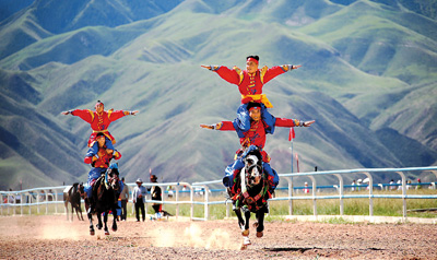 甘肅省肅南縣搶抓“一帶一路”機遇,打造全域旅游“自然生態(tài)博物館”,進一步弘揚民族傳統(tǒng)文化,展示當?shù)貪庥舻拿褡屣L情和獨特的自然景觀,促進當?shù)芈糜挝幕w育融合發(fā)展。圖為賽馬選手在肅南縣日前舉辦的索朗格國際賽馬場進行馬術表演。