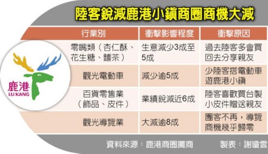 大陸游客減少后,臺(tái)灣旅游業(yè)“冷颼颼”。據(jù)臺(tái)灣《中國(guó)時(shí)報(bào)》報(bào)道,過(guò)去大陸游客團(tuán)赴臺(tái),若住宿中部準(zhǔn)備出發(fā)前往日月潭途中,必定會(huì)先到訪(fǎng)鹿港小鎮(zhèn)。民意代表王惠美觀察,大陸游客不來(lái)之后,光是中山路上的店家生意就掉了一半。觀光電動(dòng)車(chē)、賣(mài)小吃和皮件的攤商感受最深,曾經(jīng)忙到應(yīng)接不暇的導(dǎo)覽解說(shuō)員,現(xiàn)在只能主動(dòng)出擊,通過(guò)民間協(xié)會(huì)發(fā)函邀請(qǐng)大陸游客組團(tuán)赴臺(tái)交流參訪(fǎng)。