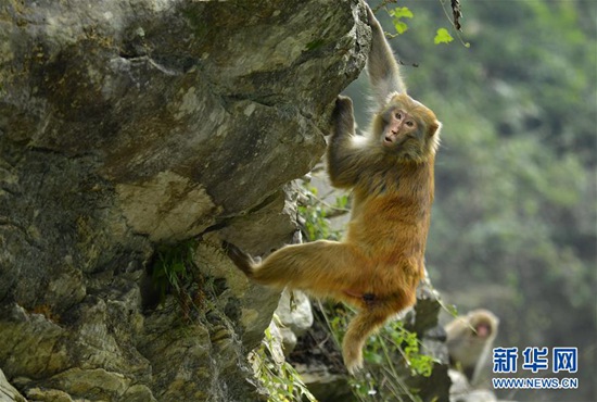 12月27日,在湖北省宣恩縣獅子關(guān)村,一只獼猴沿著人們?cè)诤由侠睦K索,爬到河對(duì)岸覓取食物。