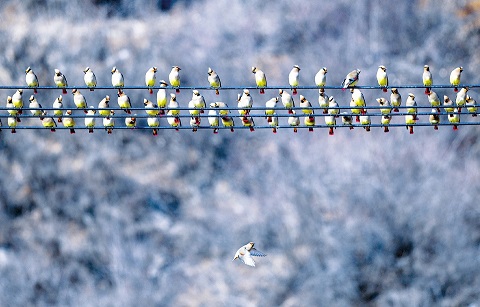 從去年10月下旬開始,有大量的小太平鳥進入沁源縣境內,主要棲息在靈空山自然保護區(qū)、菩提山森林公園等地,到今年2月下旬,鳥群逐漸增多。本周以來,已有近萬只小太平鳥棲息于沁源縣境內,場面頗為壯觀,為綠色沁源又增添了一道亮麗的風景。圖為3月28日沁源縣境內拍攝的一群小太平鳥。