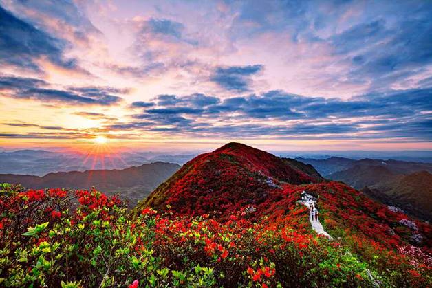 同樣選擇在薄霧初上的黎明出發(fā),順著龍泉山蜿蜒的石板路拾階而上,途徑一座古樸典雅的半山?jīng)鐾さ诌_(dá)山頂,眼前的奇觀如畫卷般徐徐展開:這是一片壯闊的云海,幾處鮮艷的杜鵑花叢在云霞中若隱若現(xiàn),云海下隱藏著一整片杜鵑花海,延綿好幾公里,將龍泉山脈裝點(diǎn)得一派火紅,日出時(shí)東方天際噴涌而出的紅霞映照著云海杜鵑,仿佛給空氣鑲上了紅色濾鏡,一時(shí)間群山都變得奇幻瑰麗,這是丹寨龍泉山別具一格的云上杜鵑花?!坪2幌∑?,花海也常有,云上花海卻是大多數(shù)人這輩子難得一見(jiàn)的奇觀,想親眼目睹嗎?