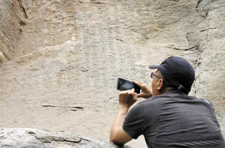 離開龍泉寺遺址,四人順著石階退下廟宇高臺(tái),在王老師的引導(dǎo)下,尋找那片記憶中的摩崖石刻。終于在高臺(tái)東側(cè)約40米處的山體上,發(fā)現(xiàn)高懸兩米的摩崖石刻。一片巖壁上刻有國(guó)子監(jiān)生行書《龍泉寺記》。巖壁上鑿刻有一方石窟,石窟內(nèi)供奉“龍王”,石窟外懸掛有當(dāng)?shù)卮迕駚泶饲笥瓿晒Φ腻\旗。大家出于好奇,搭人梯攀巖,仔細(xì)辨認(rèn)石刻字面,想看個(gè)究竟。整個(gè)石碑高不達(dá)3米,寬約2米,整體呈含胸內(nèi)斂之勢(shì),可蔽風(fēng)雨侵蝕。卻因時(shí)年久遠(yuǎn),底部泥土沉淀遮擋,部分文字不可通讀。粗略判斷全文10列,每列32字,單字大小7厘米,共約300余字。