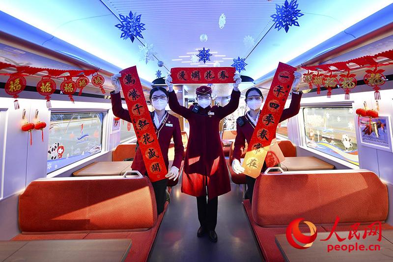 2021年春運(yùn)是疫情防控常態(tài)化下的首個春運(yùn),全國上下提倡就地過年,鐵路部門科學(xué)調(diào)整運(yùn)力,努力實(shí)現(xiàn)“平安春運(yùn)、有序春運(yùn)、溫馨春運(yùn),讓旅客體驗(yàn)更美好”的春運(yùn)目標(biāo)。2021年2月4日,正值北方小年,同時也是北京2022年冬殘奧會開幕倒計(jì)時一周年,北京局集團(tuán)公司北京客運(yùn)段京張高鐵車隊(duì)擔(dān)當(dāng)?shù)腉8881次列車始發(fā)前,列車工作人員用窗花等裝飾品布置車廂,打造溫馨的出行環(huán)境,營造濃濃的“年味”。(圖片來源:北京鐵路局集團(tuán)公司北京客運(yùn)段 毛衛(wèi)華 攝)