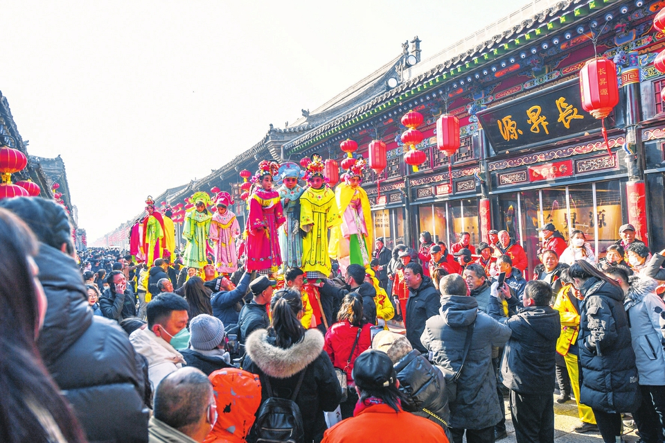 1月31日,游客在平遙古城觀看民俗社火表演。元宵節(jié)臨近,平遙古城內舉行具有當?shù)靥厣拿袼渍寡莼顒樱瑹釤狒[鬧迎元宵。