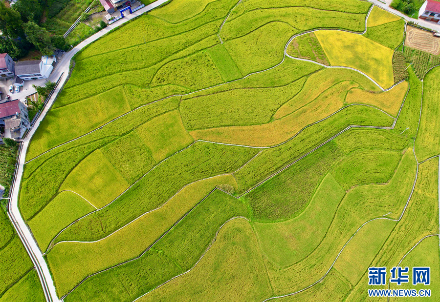??鶴峰縣走馬鎮(zhèn)千金村的葛稻共生基地稻谷飄香。新華網(wǎng)發(fā) 申玉潔 攝