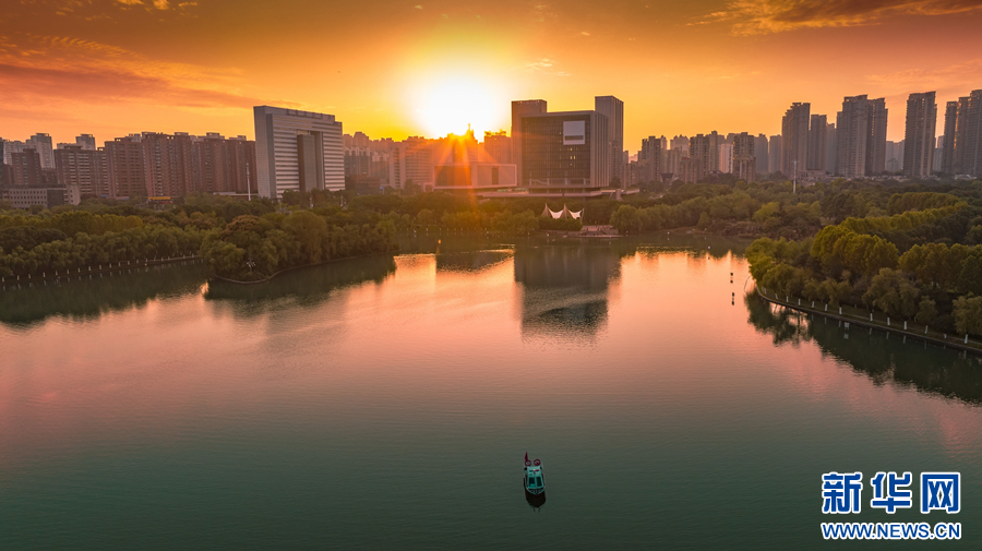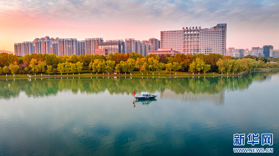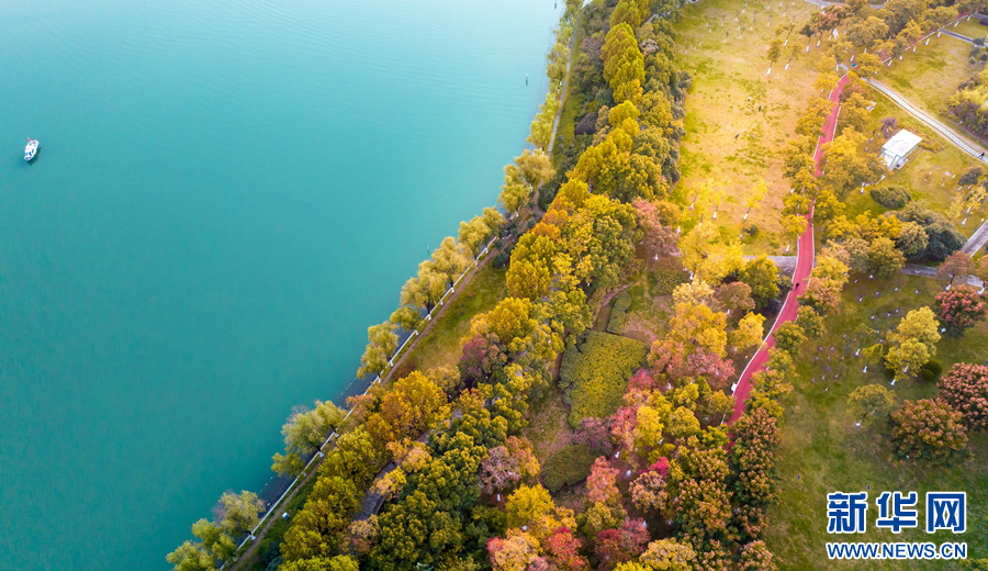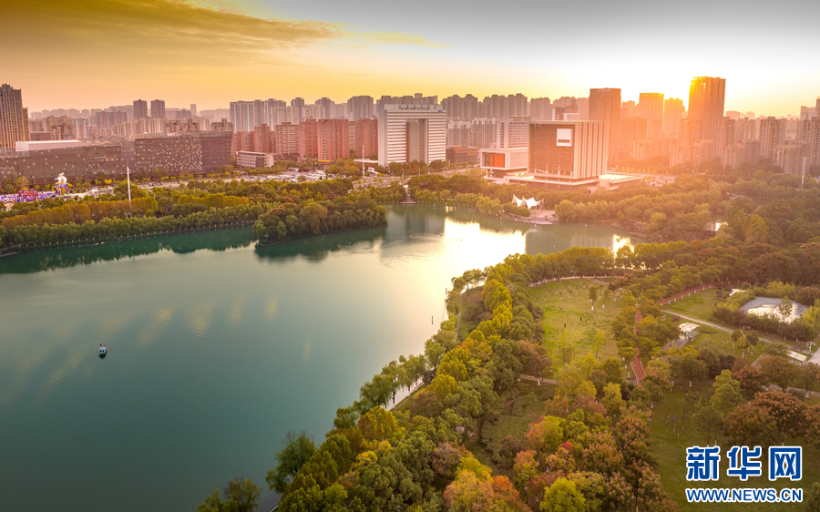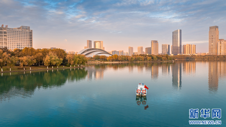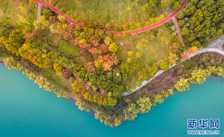 近日,在安徽省合肥市政務區(qū)天鵝湖畔,層林盡染,景色旖旎。周圍的樹木、建筑物,與清澈的湖水交相輝映,渲染成一幅色彩斑斕的迷人畫卷。新華網(wǎng)發(fā)(劉玉才 攝)