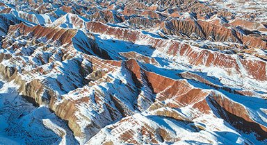 2023年12月15日,甘肅省張掖市在一場降雪之后,潔白的雪花將七彩丹霞裝扮得美輪美奐,白雪宛如輕紗浸在丹霞山上,顯得格外艷麗多彩、如夢如幻。雪后放晴,鏡頭下的甘肅張掖七彩丹霞景區(qū)被雪色覆蓋,顯現(xiàn)出“雪浴丹霞”景觀。殷旭攝(人民圖片網(wǎng))