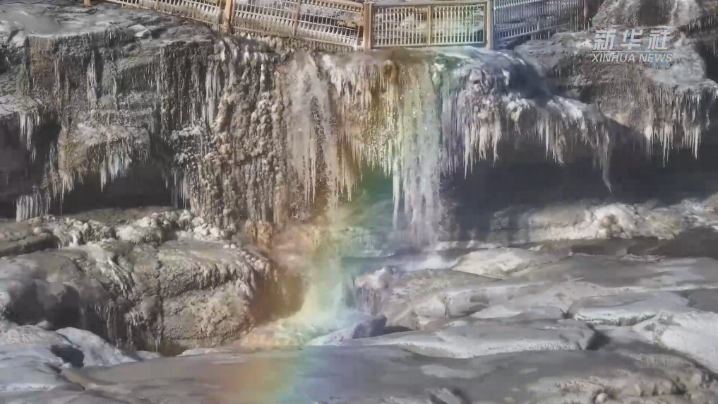 近日,受降溫天氣影響,黃河壺口瀑布出現(xiàn)冰掛美景,層層疊疊,晶瑩剔透,與瀑布上空的彩虹交相輝映,為冬日的壺口瀑布增添一抹亮色和詩意。