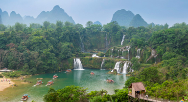 德天瀑布位于廣西壯族自治區(qū)崇左市大新縣碩龍鎮(zhèn)德天村,中國(guó)與越南邊境處的歸春河上游。瀑布?xì)鈩?shì)磅礴、蔚為壯觀,與緊鄰的越南板約瀑布相連,是亞洲第一、世界第四大跨國(guó)瀑布。劉國(guó)興攝(人民圖片網(wǎng))