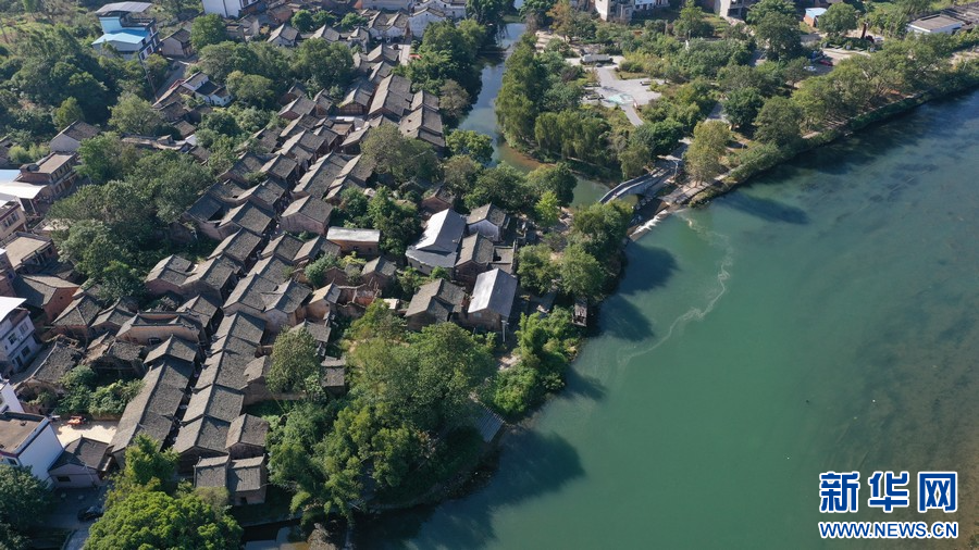 江口村布局呈現(xiàn)魚骨狀,沿著河道及山腳分布。(新華網(wǎng)發(fā) 汪家榮 攝)