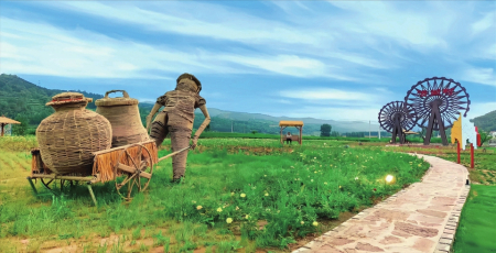 游走村內(nèi),瀟河源文化主題公園里有不少新穎物件:風(fēng)動的鐵藝風(fēng)車,像向日葵一般對著太陽開合;可以鍛煉用的水槍,需要用力向下壓幾下才能噴出很遠(yuǎn)的水,用來澆灌花叢;還有會唱歌的“石頭”、用木條編制成的敲鑼大兔子……村內(nèi)樹木叢生,百草豐茂,綠葉水光交織,讓人心曠神怡,流連忘返。