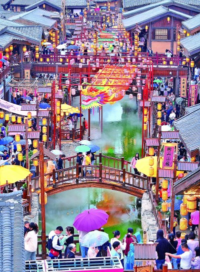 游客在湖南衡陽南岳區(qū)“南岳里”廟會民俗美食街區(qū)游玩。新華社發(fā)