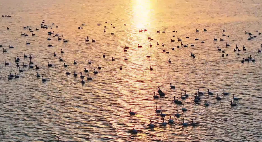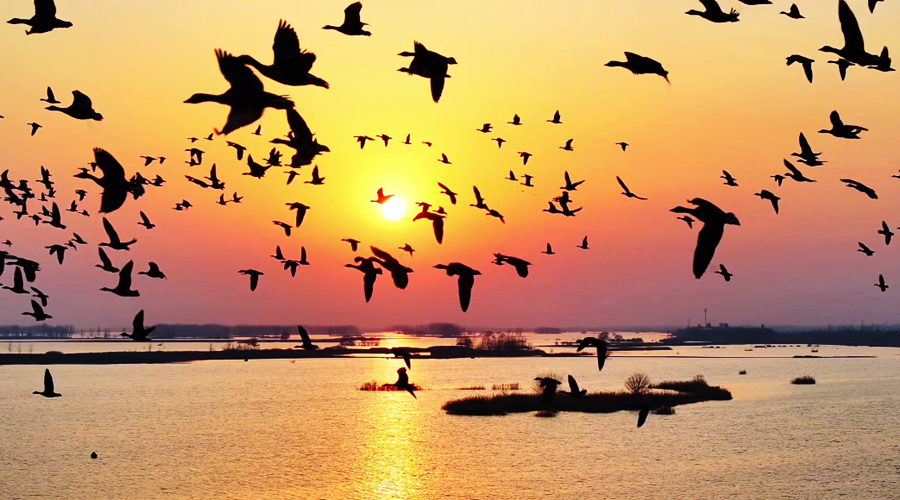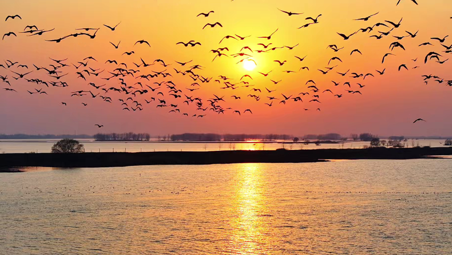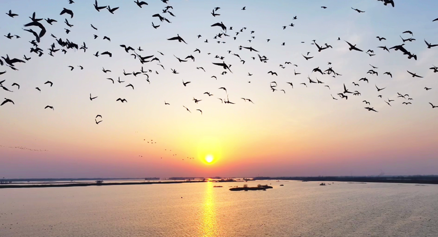 ?初春時分,在夕陽余暉映照下,安徽省潁上縣秋家湖濕地被染上一層夢幻般的色彩。放眼望去,成群飛鳥與漫天霞光融為一體,繪就出一幅壯美而靈動的生態(tài)畫卷。(徐紅梅)