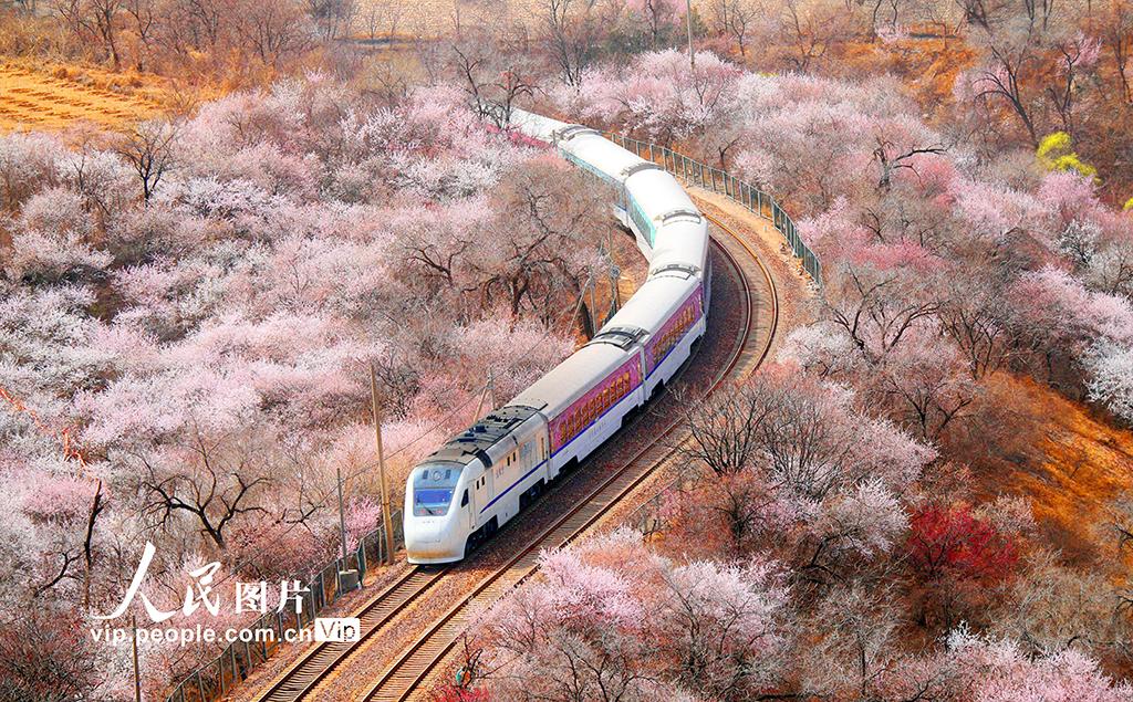 2025年3月23日,居庸關(guān)長城腳下繁花似錦,北京市郊鐵路S2線列車悠然穿行其間,該線列車因途經(jīng)多處風景名勝,被贊譽為“開往春天的列車”。張秀科攝(人民圖片網(wǎng))