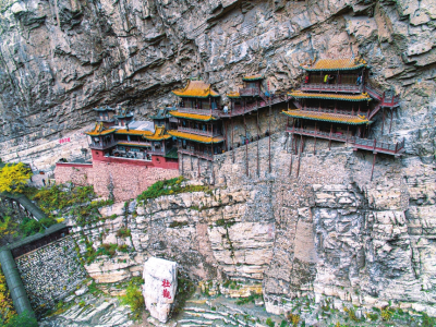 懸空寺位于恒山第二主峰翠屏峰的半崖峭壁間,始建于北魏后期,距今已有1500多年的歷史。整個(gè)建筑上載危巖,下臨深谷,樓閣懸空,結(jié)構(gòu)奇巧,是我國古建筑中罕見的杰作,堪稱“天下一絕”。詩仙李白游懸空寺后揮毫寫下“壯觀”二字,以表其懷。明代旅行家徐霞客在其著作《徐霞客游記》中稱贊懸空寺為“天下巨觀”。歷史文化名城保護(hù)委員會(huì)副主任、著名文物專家鄭孝燮視察懸空寺后題詞:“懸空寺玄、絕、奇、險(xiǎn),百來百看不厭”。