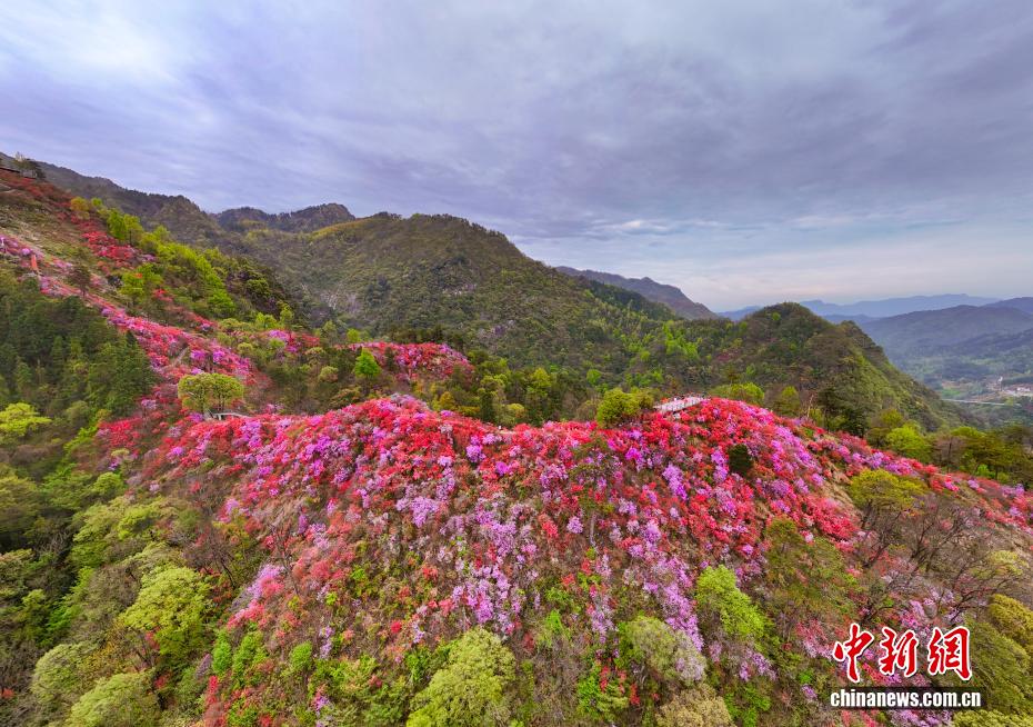 清明假期,位于大別山腹地的安徽省安慶市岳西縣河圖鎮(zhèn)天峽風(fēng)景區(qū)內(nèi),千畝野生高山杜鵑迎來最佳觀賞期。漫山遍野的杜鵑花海沿山脊鋪展,紅、粉、紫、白各色花朵競相綻放,將大別山腹地裝點成一幅絢麗的春日畫卷。圖為4月5日杜鵑花盛開景色。
