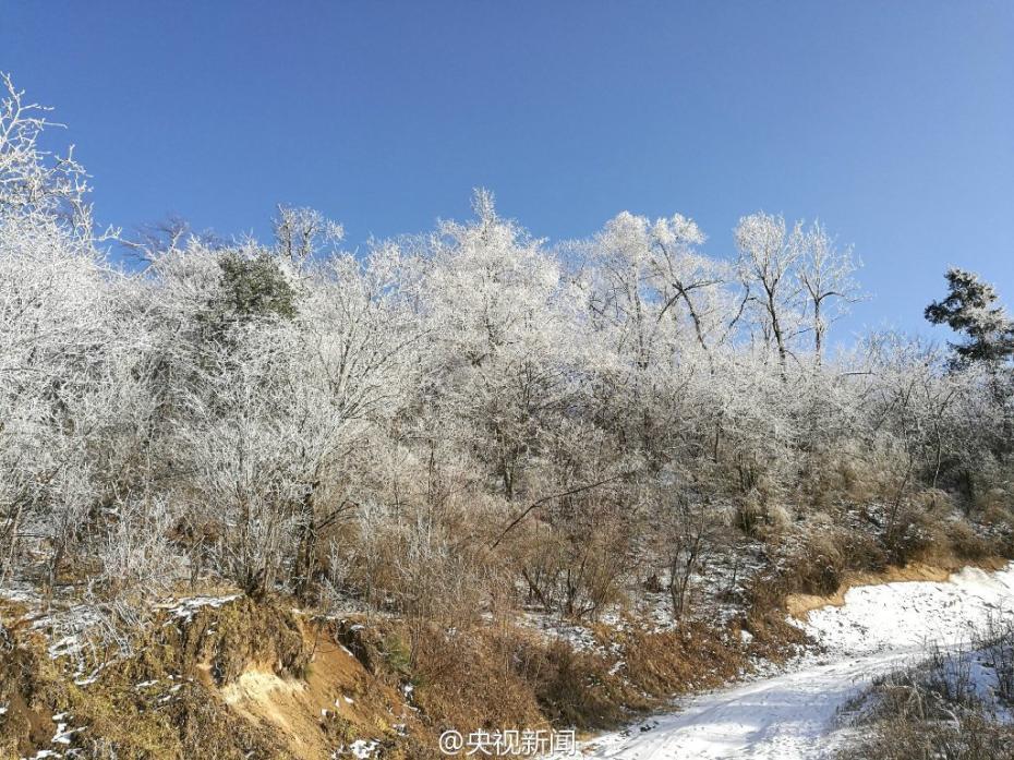受較強冷空氣影響,秦嶺腹地涼風(fēng)埡山頂,出現(xiàn)大面積霧凇景觀。玉樹瓊枝,晶瑩剔透,讓涼風(fēng)埡山頂變得像童話世界一般,美不勝收。 央視記者王志杰 圖片來源:央視新聞微博