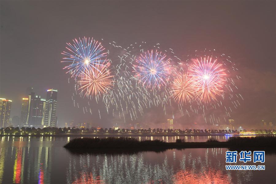 2017年1月1日夜晚,長沙橘子洲附近湘江上空綻放絢麗焰火。當晚,湖南長沙橘子洲舉行焰火晚會慶祝新年到來。整場焰火晚會主題為“多彩星城、魅力長沙”,焰火燃放時間約20分鐘。 新華社記者 龍弘濤攝