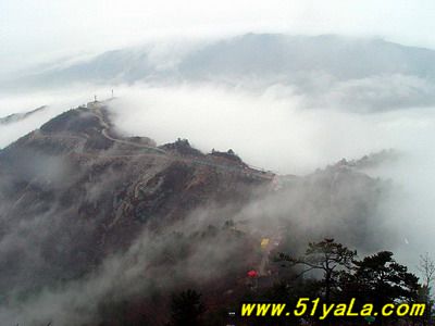 北武當(dāng)山主峰四周幾乎都是陡壁懸崖,只有一條人造“天梯”可攀。來到山腳下,過五里黃土、五里沙路,便是1400余級就山鑿筑的石階,凡險峻之處,設(shè)有鐵索扶手。石階一線疊置,從下仰視,宛如“天梯”。游人攀登,每一步都可聽到悠揚(yáng)頓挫的“石音”,形成獨(dú)特的“石樂”絕景。沿著石階,奇松異石、廟宇石刻,掩沒在蔥郁的山林植被之中,相間點(diǎn)綴,相映成趣。主要的山石景觀有:古猿望日、石豬受難、九龍出洞、石象守山、天壺傾露、石羊朝圣、石龜下蛋、石虎、石蛤蟆、龜蛇斗智等。最令人稱奇的是“龜蛇斗智”奇觀,相傳神龜和青蛇不安心修道,互相格斗,經(jīng)過七七四十九天的麈戰(zhàn),神龜節(jié)節(jié)敗退,青蛇步步緊逼。其時,恰逢真武大帝返宮,見狀,輕輕用手指一點(diǎn),龜蛇便動彈不得,從此永久停留在這里,成千古一絕——“蛇石”虎視眈眈,“龜石”尾臨懸崖,萬斤重石,峭立崖畔,用力一推或經(jīng)風(fēng)一吹,便搖搖欲墜,令人心懸,所以又稱風(fēng)動石,為我國罕見的景觀之一。主要的奇松景觀有:鴛鴦松、迎客松、托天松、母子松等。最使人嘆為觀止的是“擎天探海松”,其松立于石階半道,樹身技分兩杈,一直刺青天,一枝瞰群峰。近金頂?shù)悄咸扉T石階,旁邊陡崖上刻有“喬松”二字,據(jù)載為清代道光年間永寧州牧王繼賢手跡?,F(xiàn)存喬松樹樁直徑近1米,可以想見其昔日雄姿。主要的懸崖峭壁有:千仞壁、舍身崖、鷹嘴崖等。還有呈垂直分布的植被,其色彩和花期隨季節(jié)變化,給北武當(dāng)山披上了“春粉、夏艷、秋紅、冬白”的盛裝。登臨武當(dāng)之巔,一覽眾山,但見遠(yuǎn)山蒼茫,近日含黛,松風(fēng)撲面,白云飄逸;只聞松濤陣陣,山泉潺潺,鳥語唧唧,似琴弦輕撥;夏秋之季,如晴空萬里,金頂之下,叢林景觀相間,似七彩織錦;白云遠(yuǎn)處,群山連綿,猶如萬龍翻騰,極為壯觀。