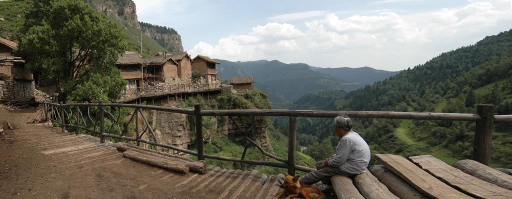 隱沒在深山老林中的王化溝分布在大約一華里長的絕壁上,背依懸崖,面臨百丈深淵。全村20余戶,60多口人。村西的懸崖上聳立著一塊巨石,村里人稱之為“石人”,村后的山也因此稱作“石人山”。村中的房子大都臨崖而建,以木柱支撐,高低錯落,避風向陽。這些房子建在懸崖上看似危險,實則非常堅固,至今還有清代的房子保存完好。由于地盤不足,所以沒了庭院,只有一條走廊。就是街道也只能用木料搭建,懸于空中。當然作為農家,牲畜的圈舍是免不了的,這里也需要精心擺布,精心建造,絕不至于讓牲畜落下深淵。