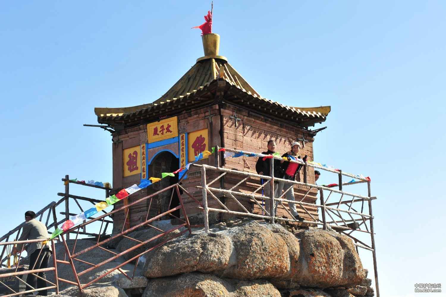 蘆芽山主峰絕頂周方僅約10平方米的石坪上,巍然托起一座正方體狀石砌建筑,這便是太子殿。三面懸崖,甚為險峻。因其位居群山之極,數(shù)十里外即可看到。太子殿為石壁構(gòu)筑,殿脊有一鐵棍直指蒼穹,似為避雷特置。殿頂向四面披散,原以銅瓦鋪蓋,今已遺失。殿門北向而開,門據(jù)有石鑿“太子殿”三字赫然醒目。兩側(cè)墻壁又鑿“佛祖”二字,工整雄勁。殿門兩側(cè)石刻聯(lián)語系光緒年間白文良倡修該殿時書鑿,句為:復(fù)慈云于中國,性潔雨于邊方。著名書法家黃克毅有詩贊太子殿景致: