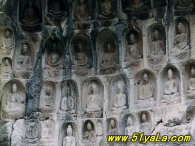 千佛崖在山西霍縣南7.5公里郭莊村山腰。山巒聳峙,山花爛漫,摩崖造像隱現(xiàn)其間。始刻于唐代,宋、元時(shí)屢有造鑿,直至明正德五年(1501年)始結(jié)束。本尊大佛高約8米,下部刻有唐貞觀以及天寶五年(公元746年)、長(zhǎng)慶二年(822年)等題記。千手千眼觀音像高約2米,為元代所造。其余小佛多為三軀一組(一佛二菩薩或一佛二弟子),亦有單佛一龕者,刻工精湛,造型生動(dòng),極富民間特色。