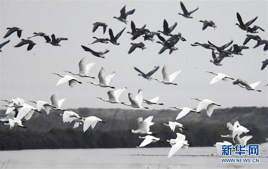 11月29日,候鳥在江西鄱陽(yáng)湖南磯濕地國(guó)家級(jí)自然保護(hù)區(qū)飛翔。近日,大批南遷候鳥飛抵鄱陽(yáng)湖棲息越冬。