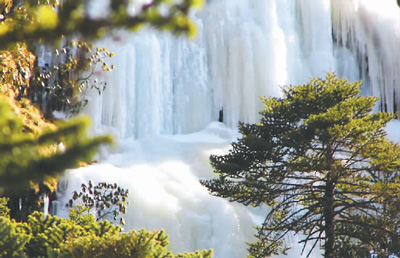 在著名的三疊泉瀑布前,原本飛流直下三千尺的壯觀場(chǎng)面不見了,呈現(xiàn)在游客眼前的是一條巨大的玉帶倒掛在崖壁上。險(xiǎn)峻的石巖上,已是懸崖百丈冰,不少參差不齊的冰凌懸掛在石巖上,往日桀驁不馴的瀑布此時(shí)變得溫馴了。整個(gè)山澗白茫茫一片,被晶瑩剔透的冰柱所覆蓋,銀裝素裹,氣勢(shì)恢宏,場(chǎng)面極為壯觀。此時(shí)雖聽不到往昔轟隆隆的瀑布聲,但能一睹這懸掛在石崖上的冰瀑,卻是別有一番景致。