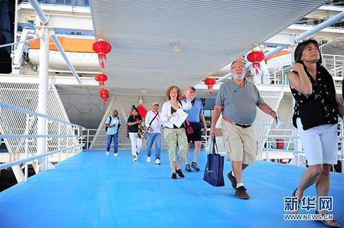 1月31日,在三亞鳳凰島國際郵輪港,“威斯特丹號”游客準備上岸。 新華社發(fā)(沙曉峰 攝)