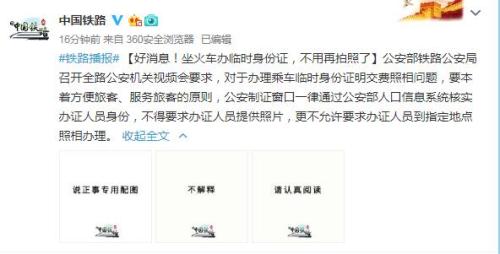 4月19日,《新華每日電訊》刊登《辦臨時身份證坐火車,非得拍照證明自己是自己?》引起社會廣泛關注。公安部鐵路公安局有關負責人回應稱,已要求所有辦證單位和人員不得再要求辦證人員提供照片。