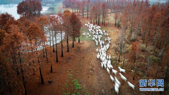 11月27日,牧歸的羊群行走在紅杉林中(無人機(jī)拍攝)。