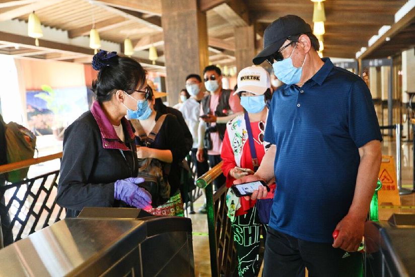 游客嚴(yán)格執(zhí)行疫情防控制度進(jìn)行核驗(yàn)后進(jìn)入景區(qū)。