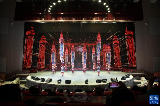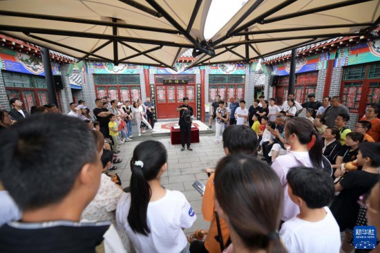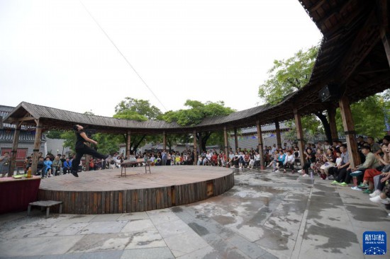 8月12日,在河北省滄州市吳橋雜技大世界景區(qū)江湖文化城,游客們觀看雜技藝人表演傳統(tǒng)雜技節(jié)目(無人機照片)。