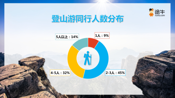 相比其他旅游項(xiàng)目,登山游對(duì)用戶的體力和意志力都是較大的挑戰(zhàn),因此,大多數(shù)登山游用戶會(huì)選擇多人結(jié)伴同行,以便于登山途中互相鼓勵(lì)、互相協(xié)助?!秷?bào)告》顯示,2-3人或4-5人同行是更多登山游用戶的選擇,出游人次占比分別為45%和32%。