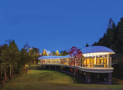 夜色朦朧中,一幢幢造型別致的建筑閃現(xiàn)眼前,或尖頂,或圓頂,點(diǎn)綴山間,乍看之下,如同天幕下支撐起一個(gè)個(gè)巨大帳篷。這里就是度假區(qū)的核心板塊,黃山關(guān)麓帳篷客酒店。從山下到山頂,別墅或獨(dú)棟,或聯(lián)排,根據(jù)地形進(jìn)行設(shè)計(jì),就像從山林中“生長”出來,一條蜿蜒曲折的小路,將它們相互連通。32套別墅以文房四寶中的墨海、紫豪、松煙、云藍(lán)命名,雅致中凸顯出一份徽州文化的情調(diào)。