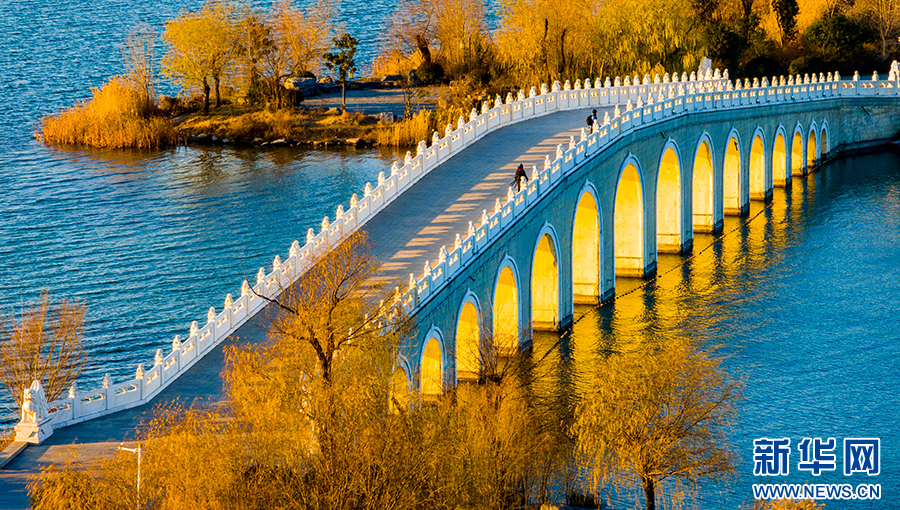 近日,天氣晴好,安徽省淮北市南湖濕地公園的十七孔橋在夕陽的照射下,呈現(xiàn)“金光穿洞”景象,美不勝收。新華網(wǎng)發(fā)(王文 攝)