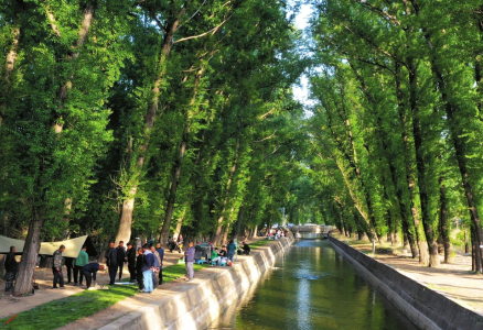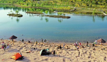 太原市西干渠,市民搭起帳篷喝茶吃燒烤,享受假日時光。