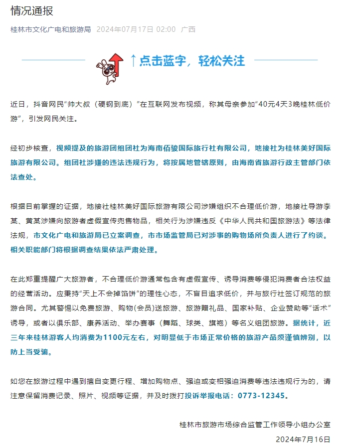 中新網(wǎng)7月17日電 桂林市文化廣電和旅游局官微發(fā)布情況通報,近日,抖音網(wǎng)民“帥大叔(硬鋼到底)”在互聯(lián)網(wǎng)發(fā)布視頻,稱其母親參加“40元4天3晚桂林低價游”,引發(fā)網(wǎng)民關(guān)注。 經(jīng)初步核查,視頻提及的旅游團(tuán)組團(tuán)社為海南佰駿國際旅行社有限公司,地接社為桂林美好國際旅游有限公司。組團(tuán)社涉嫌的違法違規(guī)行為,將按屬地管轄原則,由海南省旅游行政主管部門依法查處。 根據(jù)目前掌握的證據(jù),地接社桂林美好國際旅游有限公司涉嫌組織不合理低價游,地接社導(dǎo)游李某、黃某涉嫌向旅游者虛假宣傳兜售物品,相關(guān)行為涉嫌違反《中華人民共和國旅游法》等法律法規(guī),市文化廣電和旅游局已立案調(diào)查,市市場監(jiān)管局已對涉事的購物場所負(fù)責(zé)人進(jìn)行了約談。相關(guān)職能部門將根據(jù)調(diào)查結(jié)果依法嚴(yán)肅處理。 桂林市文化廣電和旅游局提醒廣大旅游者,不合理低價游通常包含有虛假宣傳、誘導(dǎo)消費(fèi)等侵犯消費(fèi)者合法權(quán)益的經(jīng)營活動。應(yīng)秉持“天上不會掉餡餅”的理性心態(tài),不盲目追求低價,并與旅行社簽訂規(guī)范的旅游合同。尤其警惕以免費(fèi)旅游、購物(會員)送旅游、旅游贈禮品、國家補(bǔ)貼、企業(yè)贊助等“話術(shù)”誘導(dǎo),或者以俱樂部、康養(yǎng)活動、舉辦賽事(舞蹈、球類、旗袍)等名義組團(tuán)旅游。據(jù)統(tǒng)計(jì),近三年來桂林游客人均消費(fèi)為1100元左右,對明顯低于市場正常價格的旅游產(chǎn)品須謹(jǐn)慎辨別,以防上當(dāng)受騙。