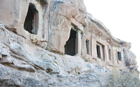 進(jìn)入寺院抬頭仰望,距現(xiàn)地表高約10米的山體上由北向南排列著九座石窟??傮w特征皆平面方形,窟頂上部外立面存有窟檐橡孔。沿山崖堆積的土丘登高看到,每窟面積約為2平方米,四壁垂直,頂部為平頂或略帶弧度。第一、三、五窟門楣雕有火焰紋裝飾,門楣內(nèi)雕飛天或花卉,門兩側(cè)設(shè)方形石柱或八棱束蓮柱。一至六窟平面呈長方形,平頂,四壁平直;七至九窟呈長方形,拱券頂;中間一孔入口兩側(cè)還刻有石雕小獸,造型生動。9窟中除第8窟為未完工的窟室和第7窟推測為僧房窟外,余下的窟俱為佛殿窟??邇?nèi)三面石壁上都刻有佛像,設(shè)低壇。四壁三龕,每龕一佛二菩薩或一佛二弟子,造像面相豐潤、頤頰飽滿。雖年久失修,風(fēng)化嚴(yán)重,但仍能從中領(lǐng)略幾分豪邁灑脫的大唐風(fēng)韻。三至六窟外壁存摩崖碑3通,均為螭首,碑文漫漶不清。據(jù)摩崖碑上“……歲次丁丑七月辛酉朔十五日乙亥建立”字跡記載,雕造于唐儀鳳二年(公元677年)。