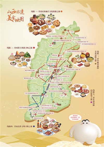 這5條非遺美食線路以“晉商文化”“面食王國”“藥膳康養(yǎng)”等為主題,以3日游或4日游為主,包括晉北民族融合文化探源之旅、晉西黃土風情尋味之旅、晉中醋香面韻美食雙絕之旅、晉南麥作文明尋根之旅、晉東南藥膳山珍秘境之旅,覆蓋醋釀、面藝等30余項省級以上非遺美食項目,串聯(lián)起太原、大同、長治等全省11市30多個非遺工坊以及眾多歷史街區(qū)、自然景觀,形成“美食+非遺+景區(qū)”的立體化文旅線路。