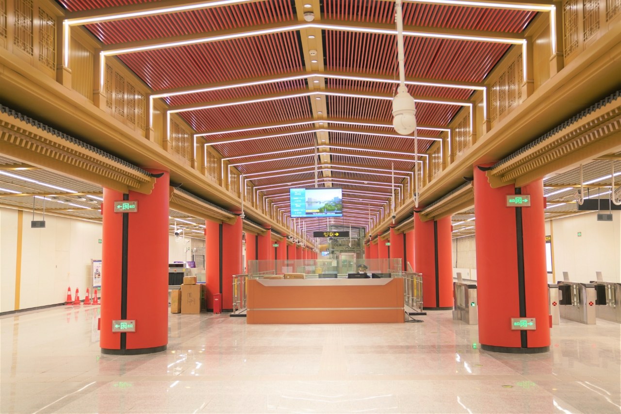 不止于此,太原地鐵2號線每一個站點,都隱藏著設計師的巧思妙想。北大街站天藍色的線條流暢得像條河,串著山西從古至今的故事,也串著山西與世界的相遇;府西街站的屋脊造型,是從山西古建中“搬”來的,翹角的弧度里藏著匠人的心思;晉陽街站的墻面印著晉商大院的磚雕,一磚一瓦都透著當年晉商走西口的豪邁;龍城大街站的屋檐,分明是五臺山延慶寺大殿的模樣,抬頭看時,仿佛能聽見古寺的鐘聲。